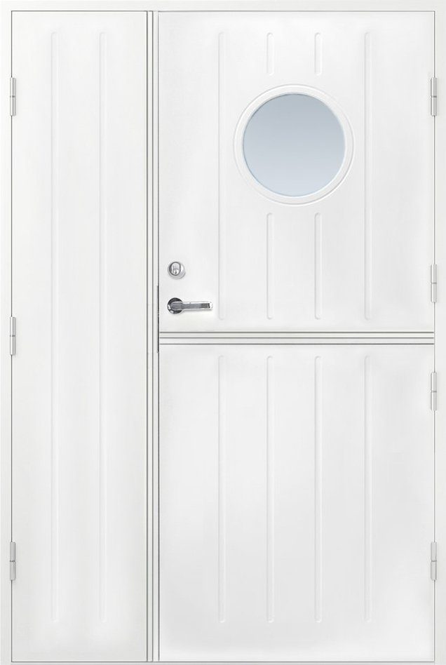 - Rahmen: Konstruktion aus Kiefernholz mit 51 mm Wärmedämmung und 0,5 mm starkem Aluminiumblech an der Innen- und Außenseite der Tür.
