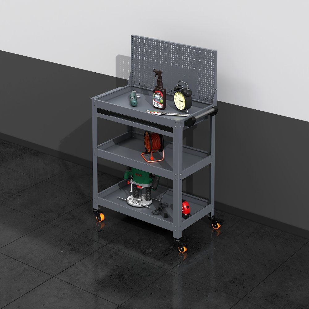 Dieser Arbeitswagen ist eine perfekte Lösung für Werkstätten, Garagen und Industrieumgebungen. Mit seinem kompakten Design und den intelligenten Aufbewahrungsmöglichkeiten hilft es Ihnen, Ihre Werkzeuge organisiert zu halten. Der Wagen ist mit drei geräumigen Ablageflächen und einer praktischen Stecktafel für einfachen Zugriff auf Ihre Werkzeuge ausgestattet.