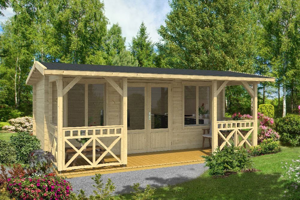 Dach und Boden bestehen aus 18 mm Rohblech, dieses ist im Bausatz enthalten. Behandelte Trageleinen für das Fundament sind ebenfalls enthalten. Das Fundament müssen Sie selbst herstellen, Materialien dafür sind nicht im Lieferumfang enthalten. Wie das Fundament hergestellt wird, hängt von den Bodenverhältnissen, dem Aussehen des Hauses und Ihren Vorlieben ab. Es kann entweder eine Platte gegossen oder ein Sockelsockel auf beispielsweise Gartenfliesen oder Leichtklinker verwendet werden.