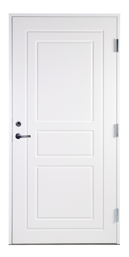 Die Tür hat einen Rahmen aus doppelt verleimtem Rahmenholz in Kiefer. Damit der Rahmen so stark wie möglich ist und nicht zusammenbricht, werden schmalere Kiefernstücke zusammengeleimt. Der Rahmen hat eine moderne Wärmedämmung im Inneren des Rahmens aus 50 mm Schaumkunststoff (EPS 200). Ein 0,5 mm starkes Aluminiumblech bedeckt sowohl die Innen- als auch die Außenseite für maximale Stabilität und Dichtigkeit. Auf diesem Aluminiumblech hat die Tür eine speziell entwickelte HDF-Platte , die wasserdicht und an unser Klima angepasst ist. Die Türschwelle ist geölt und aus der harten Holzart Eiche gefertigt, die sowohl attraktiv ist als auch viel rauer Behandlung standhält. Zusätzlich ist die Schwelle mit einem außenliegenden Aluminiumstreifen zum Schutz vor Feuchtigkeit ausgestattet. Der Türrahmen ist im Lieferumfang enthalten und aus Kiefernholz, das in der gleichen Farbe wie das Türblatt erhältlich ist.