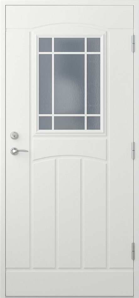 Die Tür hat einen Rahmen aus doppelt verleimtem Rahmenholz in Kiefer. Damit der Rahmen so stark wie möglich ist und nicht zusammenbricht, werden schmalere Kiefernstücke zusammengeleimt. Der Rahmen hat eine moderne Wärmedämmung im Inneren des Rahmens aus 50 mm Schaumkunststoff (EPS 200). Ein 0,4 mm starkes Aluminiumblech bedeckt sowohl die Innen- als auch die Außenseite für maximale Stabilität und Dichtigkeit. Auf diesem Aluminiumblech hat die Tür eine speziell entwickelte HDF-Platte , die wasserdicht und an unser Klima angepasst ist. Die Türschwelle ist geölt und aus der harten Holzart Eiche gefertigt, die sowohl attraktiv ist als auch viel rauer Behandlung standhält. Zusätzlich ist die Schwelle mit einem außenliegenden Aluminiumstreifen zum Schutz vor Feuchtigkeit ausgestattet. Der Türrahmen ist im Lieferumfang enthalten und aus Kiefernholz, das in der gleichen Farbe wie das Türblatt erhältlich ist.