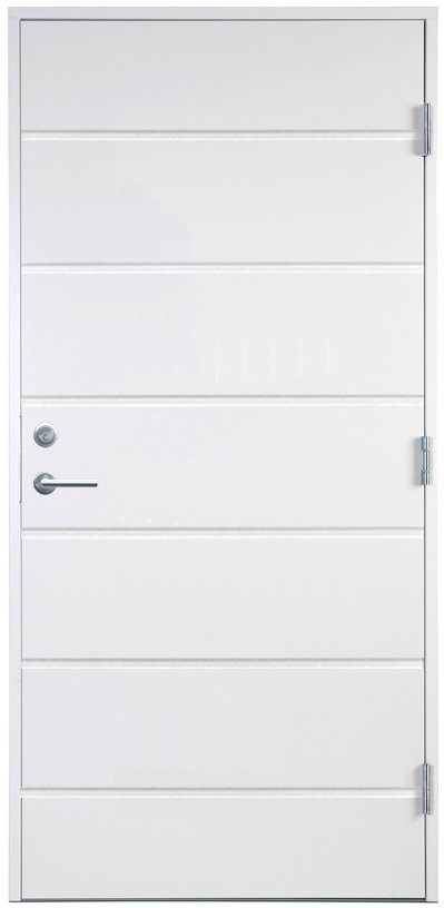 Ytterdörr Stockholm ist eine enge Tür in schlichtem Design mit gerillten geraden Linien, die horizontal verlaufen. Ansonsten hat die Tür eine glatte, feine Oberfläche, die eine gewisse Modernität signalisiert. In ihrer Schlichtheit passt die Tür in die klassische Umgebung, macht sich aber auch in der modernen Umgebung gut.