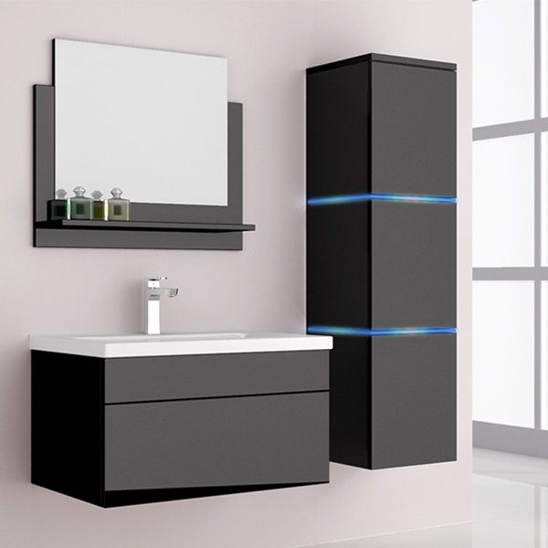 Jack ist eine unverwechselbare moderne Serie in Schwarz. Blaue LED-Leuchten tragen mit einem Gefühl von Science-Fiction bei, das zu einem coolen Licht in Ihrem Badezimmer wird. Das Badpaket umfasst insgesamt vier Teile mit Kommode, Waschbecken, Spiegel und Seitenschrank, die viel Stauraum generieren.