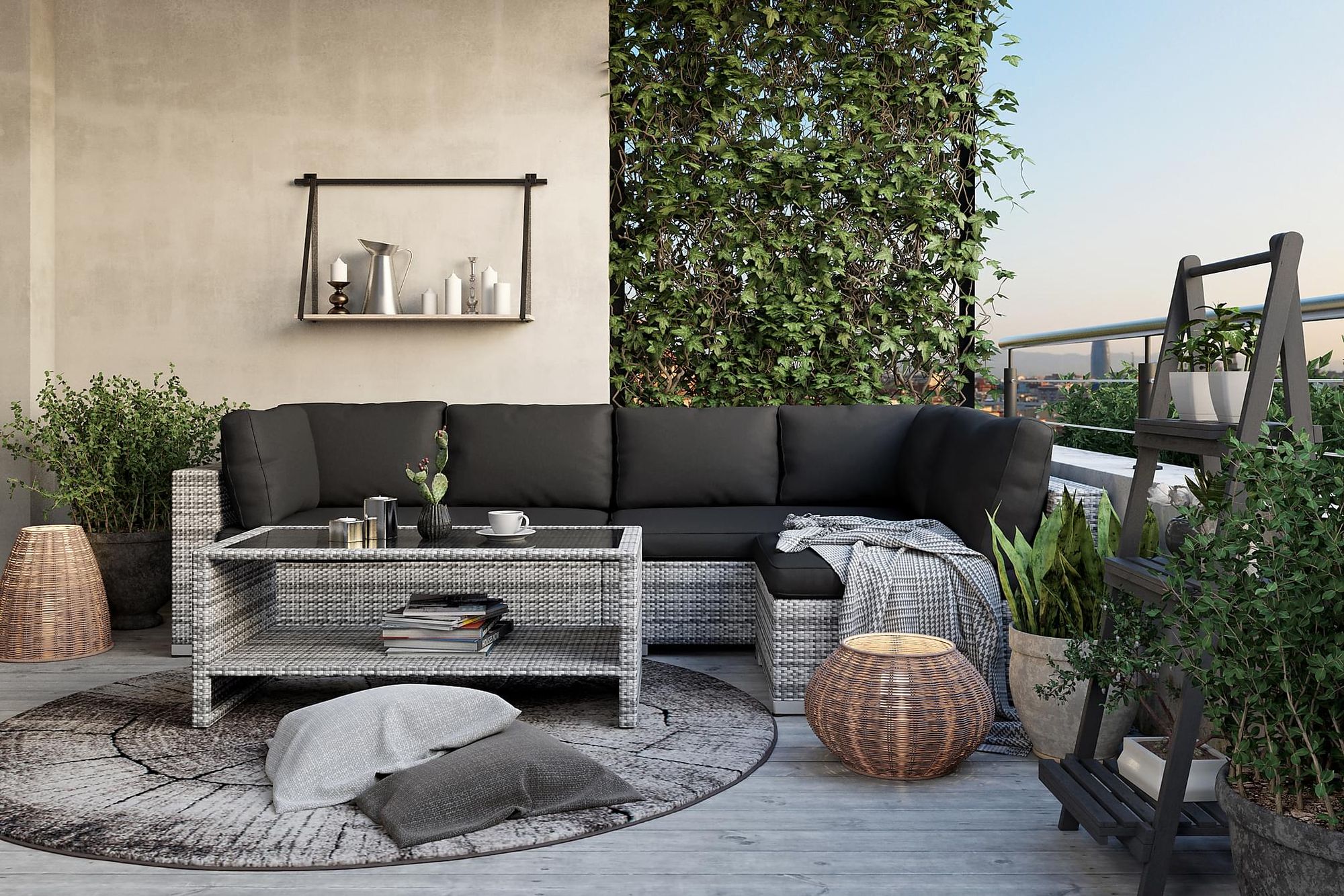 Möbel aus geflochtenem Kunstrattan sind deutlich langlebiger als echtes Rattan. Es ist ein beliebtes Material, das dem Stehen im Freien bei starker Sonne, Regen und Schmutz standhält.