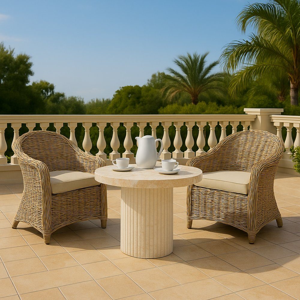 Dieses Balkonset eignet sich gut für kleinere Terrassen oder Balkone, auf denen stilvolle und funktionale Möbel gewünscht sind. Der Tisch aus der Merca-Serie hat eine runde Tischplatte aus Faserbeton mit Travertin-Aufdruck, die einen natürlichen Ausdruck verleiht, und eine strapazierfähige Oberfläche, die für den Außenbereich geeignet ist. Um die Oberfläche zu erhalten, wird ein Schutz bei starkem Regen und eine Winterlagerung empfohlen.