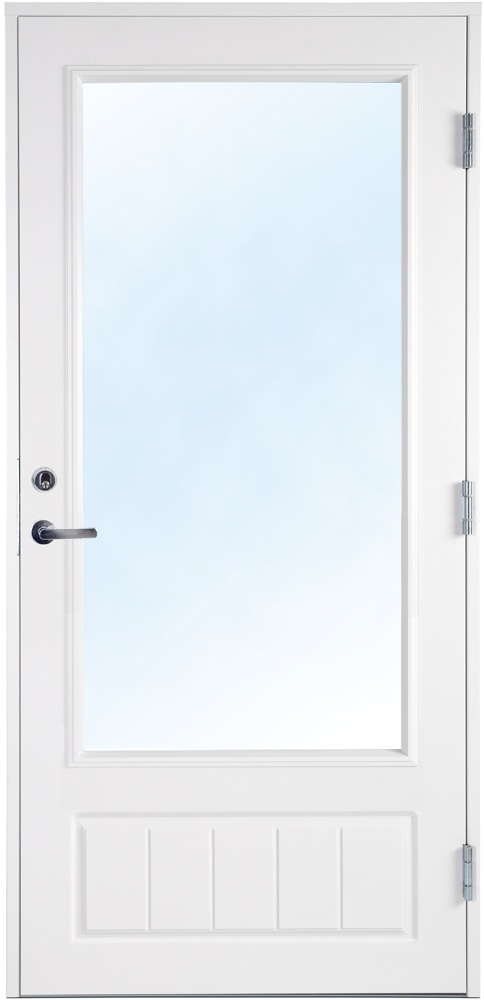 Die Tür ist unten sowohl innen als auch außen verziert. Das Fenster ist eine doppelt verglaste Isolierscheibe mit Argon, die einen niedrigen U-Wert ergibt. Das Fenster dieser Tür besteht aus Sicherheitsglas, das die Wohnungsbehörde für Glasscheiben unter 60 cm Bodenhöhe empfiehlt.
