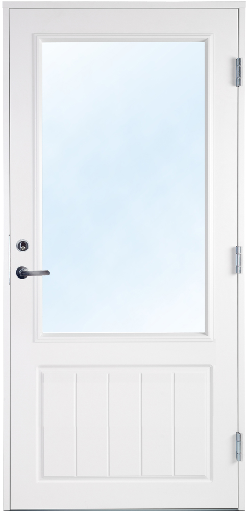 Die Tür ist unten sowohl innen als auch außen verziert. Das Fenster ist eine doppelt verglaste Isolierscheibe mit Argon, die einen niedrigen U-Wert ergibt.