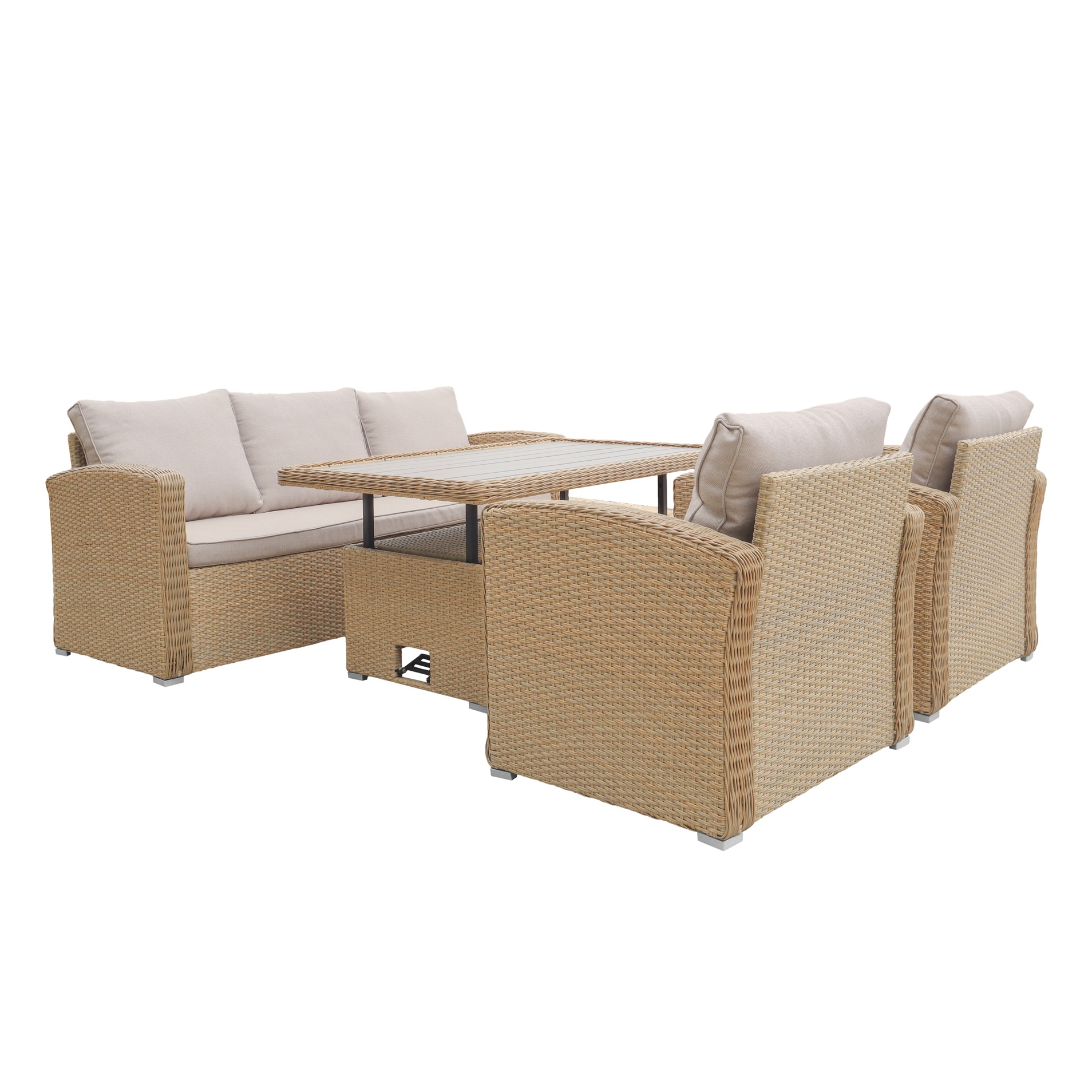 Sofagarnitur aus rundem, naturfarbenem Kunstrattan. Die Outdoor-Gruppe besteht aus einem 3-Sitzer-Sofa, 2 passenden Sesseln und einem verstellbaren Tisch. Der Tisch besteht aus synthetischem Rattan mit graubeigem Noonwood, das eine hohe Schlagfestigkeit aufweist. Durch einfaches Drücken auf die Tischplatte kann der Tisch sowohl als Couchtisch als auch als Esstisch verwendet werden.