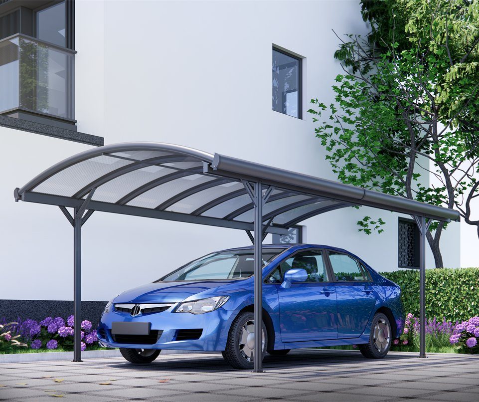 Dieser Carport ist so konzipiert, dass er Schutz vor Niederschlag und UV-Strahlung bietet. Die Konstruktion besteht aus einem Aluminiumrahmen, der korrosionsbeständig ist und ein geringes Gewicht im Verhältnis zur Festigkeit aufweist. Die Decke besteht aus 8 mm dickem Kanalkunststoff, der für eine gute Lichtdurchlässigkeit bei gleichzeitiger Reduzierung der Wärmestrahlung sorgt. Die Außenmaße des Carports betragen 505 x 303 cm und die Gesamthöhe 222 cm.