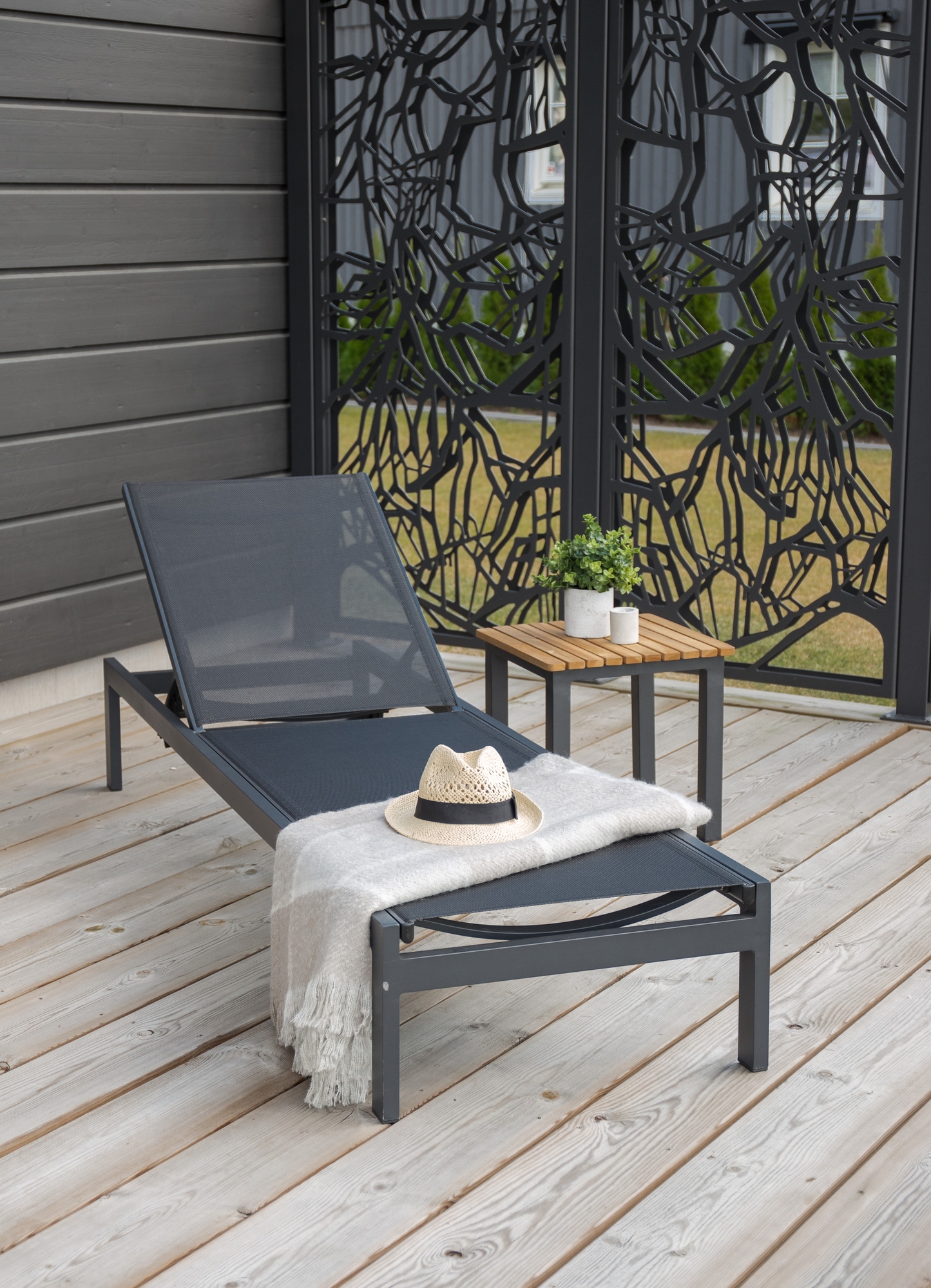 Diese Sonnenliege ist sowohl auf Funktionalität als auch auf Eleganz ausgelegt. Die verstellbare Rückenlehne bietet fünf verschiedene Positionen, sodass Sie die bequemste Position zum Entspannen finden. Der schwarze Aluminiumrahmen verleiht ein modernes Aussehen, während das Textilene-Material wetterbeständig und leicht zu reinigen ist, sodass sich die Sonnenliege perfekt für den langfristigen Einsatz im Freien eignet.