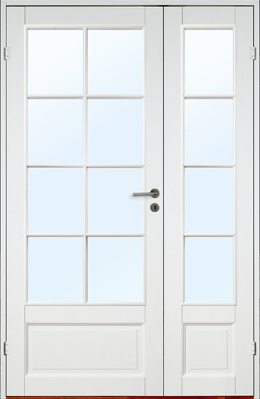 Massive Doppeltür in klassischer Spiegelteilung für viel Lichtdurchlass. Die Tür kann je nach Rahmenmontage nach innen oder außen geöffnet werden. Die Fußgängertür kann auf der linken oder rechten Seite platziert werden.