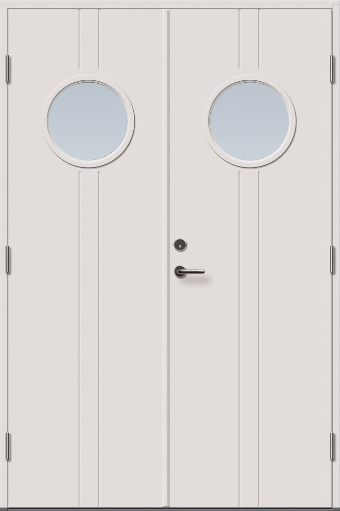 Oknö ist eine stilvolle Doppeltür mit rundem Glas und Rillenmuster außen und innen.