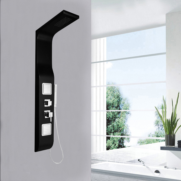 Schwarzes Duschpaneel mit silbernen Details - mit Kopfbrause, Rückenbrause und Handbrause.