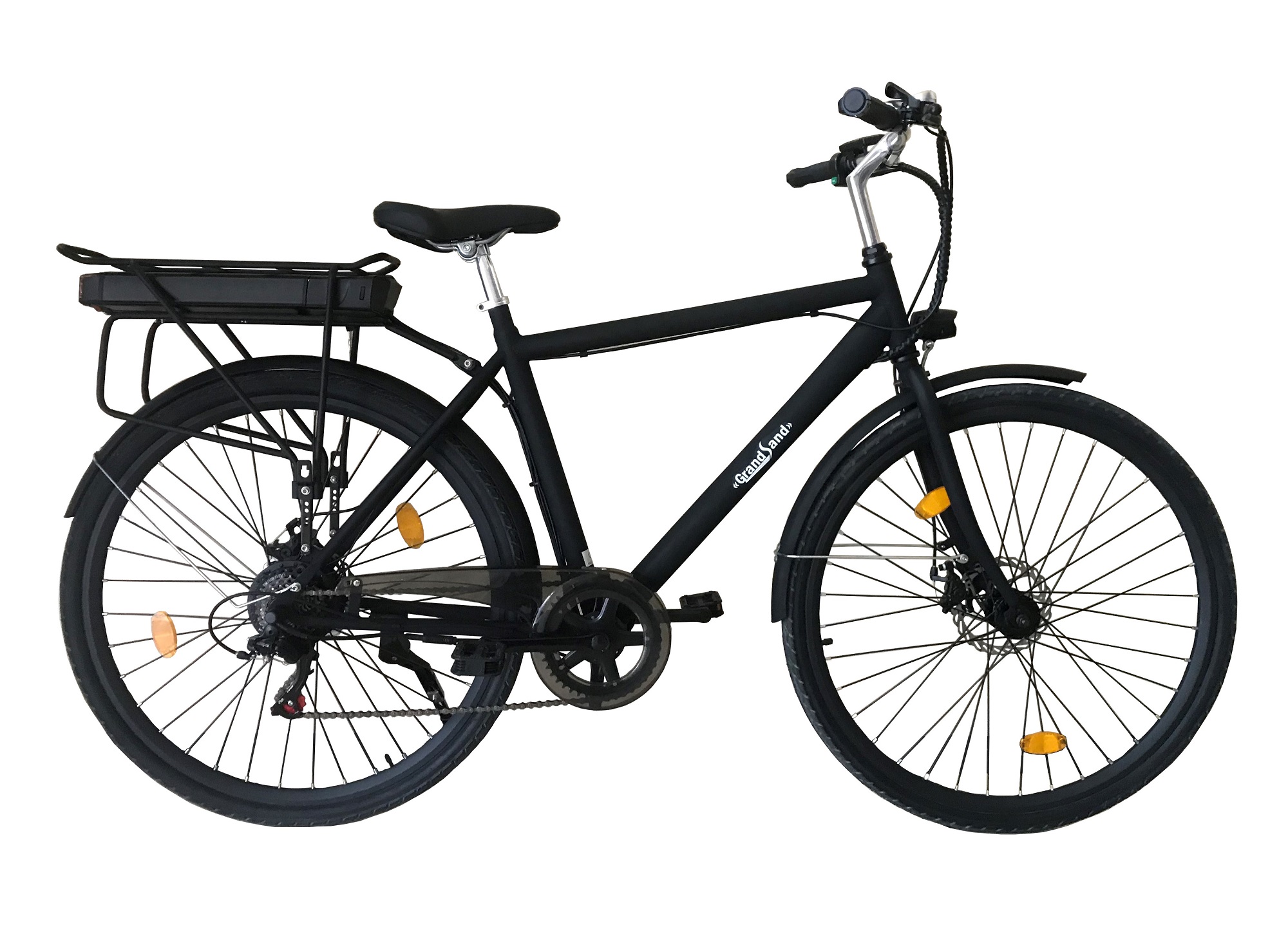 Elektrofahrrad mit einem Elektromotor von 250 W, angetrieben von einer Li-Ionen-Batterie mit 36 Volt und 10 Ah.