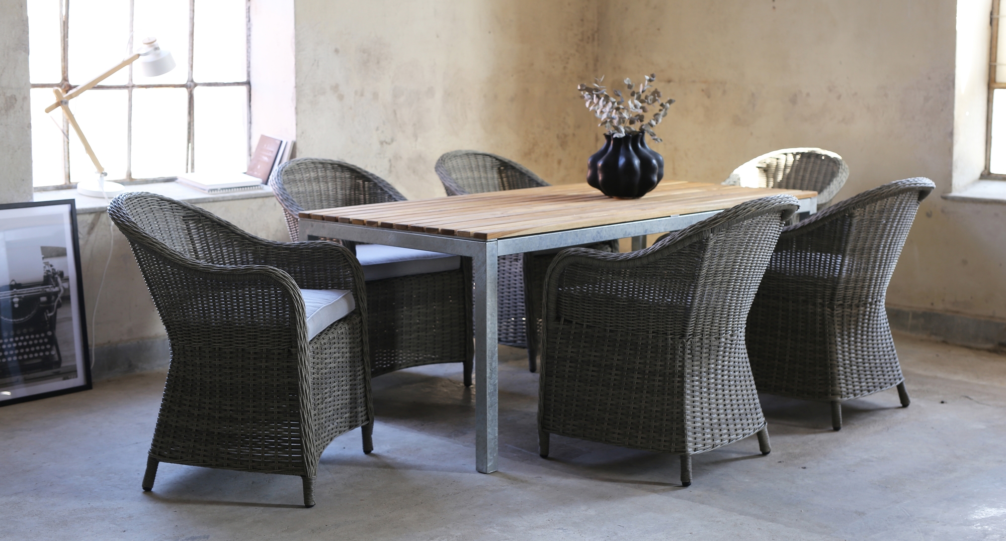 Essgruppe für Terrasse / Wintergarten. Alva Esstisch 190x90 cm mit Gestell aus verzinktem Stahl mit massiven Teakstangen für die Platte. Sechs passende Quecksilber-Sessel aus grauem Kunstrattan machen dies zu einer guten Essgruppe für die ganze Familie.