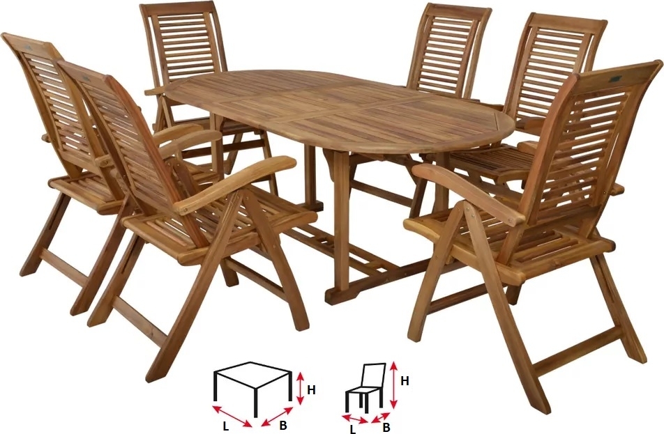 Essgruppe im Freien mit luxuriösen Klappstühlen und einem großen, schönen Tisch mit Einsatz für 6 Personen. Der Tisch ist volle 200 cm lang mit Einsatzplatte und 150 cm lang ohne Einsatzplatte und bietet Platz für Familie und Freunde. Die Einlegeplatte lässt sich einfach zusammenklappen und unter dem Tisch verstauen. Die Stühle können auch zusammengeklappt werden und sind dann einfacher über den Winter zu verstauen. Der warme Ton des Akazienholzes verleiht der Outdoor-Gruppe einen natürlichen Look, der sich perfekt in den Wintergarten einfügt, um die Umgebung mit der Natur im Garten zu verbinden. Es wird empfohlen, diese Lebensmittelgruppe vor Niederschlägen zu schützen, aber es ist auch möglich, sie an einem exponierteren Ort im Garten aufzustellen und richtig zu pflegen.