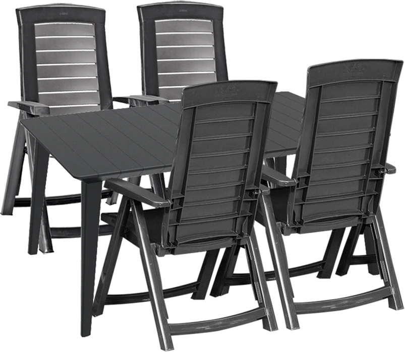 Sehr praktisches Gartenmöbel-Set bestehend aus vier verstellbaren Stühlen und einem Tisch. Geeignet für geschützte Gärten, unter Terrassendächern und dergleichen.