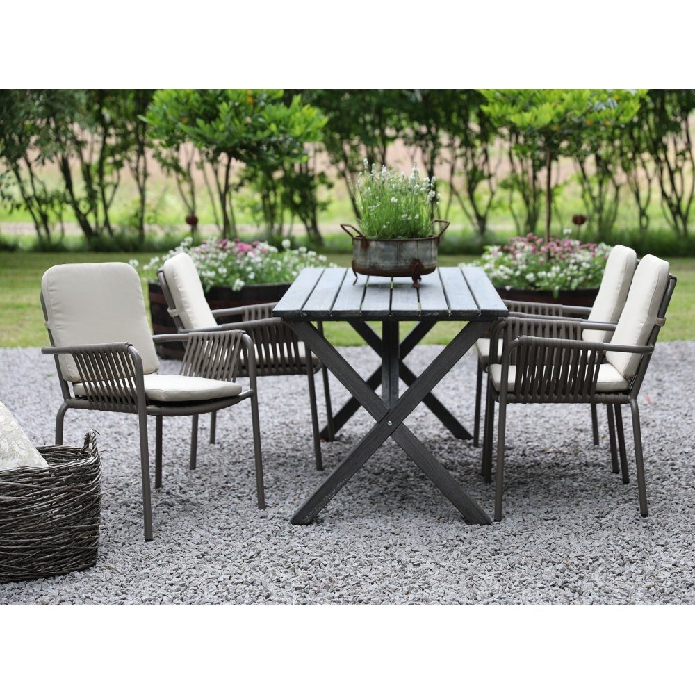 Essgruppe für die Outdoor-Möbel, 150 cm langer Tisch aus grau gelaserter Kiefer mit gekreuzten Beinen und 4 passende bequeme Lincoln-Stühle aus grau lackiertem Aluminium mit beigem Kissen. Die Stühle sind zur einfachen Aufbewahrung stapelbar. Eine Essgruppe in Harmonie, bei der die Möbel gut zusammenpassen und ein schwer zu übertreffendes Ganzes bilden. Passt genauso gut in den Wintergarten wie auf den Balkon.