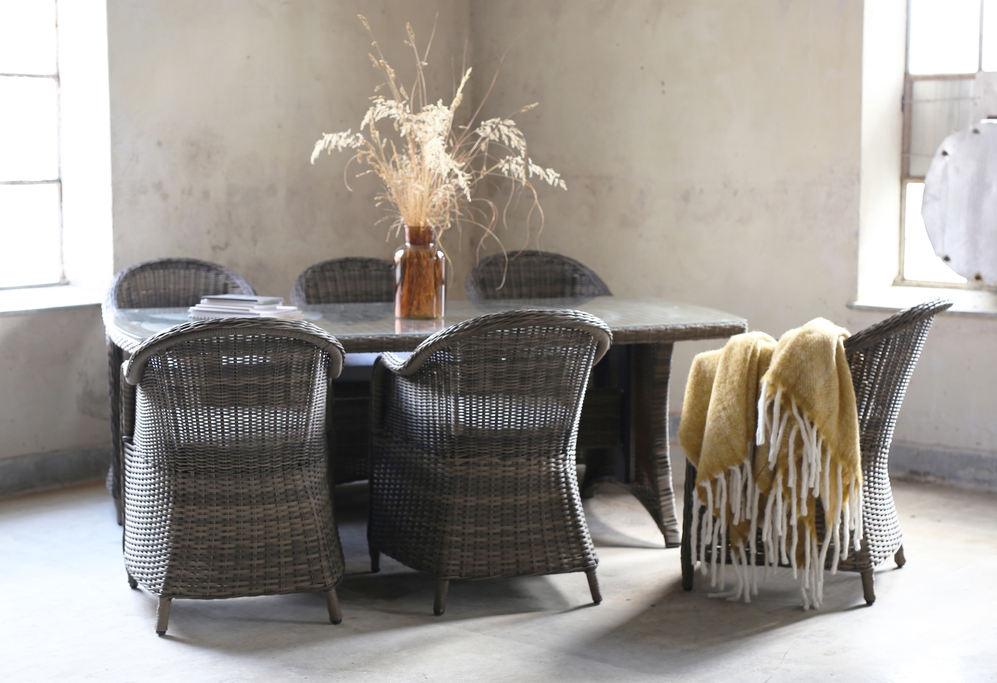 Essgruppe für Terrasse / Wintergarten. Sienna Esstisch aus naturfarbenem Rattan und 6 passende Mercury Sessel. Eine Essgruppe in Harmonie, bei der die Möbel gut zusammenpassen und ein schwer zu übertreffendes Ganzes bilden.