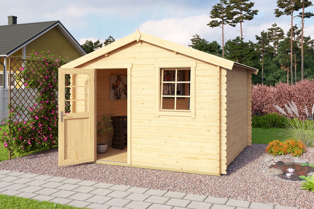Dach und Boden bestehen aus 18 mm Rohblech, dieses ist im Bausatz enthalten. Behandelte Trageleinen für das Fundament sind ebenfalls enthalten. Das Fundament müssen Sie selbst herstellen, Materialien dafür sind nicht im Lieferumfang enthalten. Wie das Fundament hergestellt wird, hängt von den Bodenverhältnissen, dem Aussehen des Hauses und Ihren Vorlieben ab. Es kann entweder eine Platte gegossen oder ein Sockelsockel auf beispielsweise Gartenfliesen oder Leichtklinker verwendet werden.