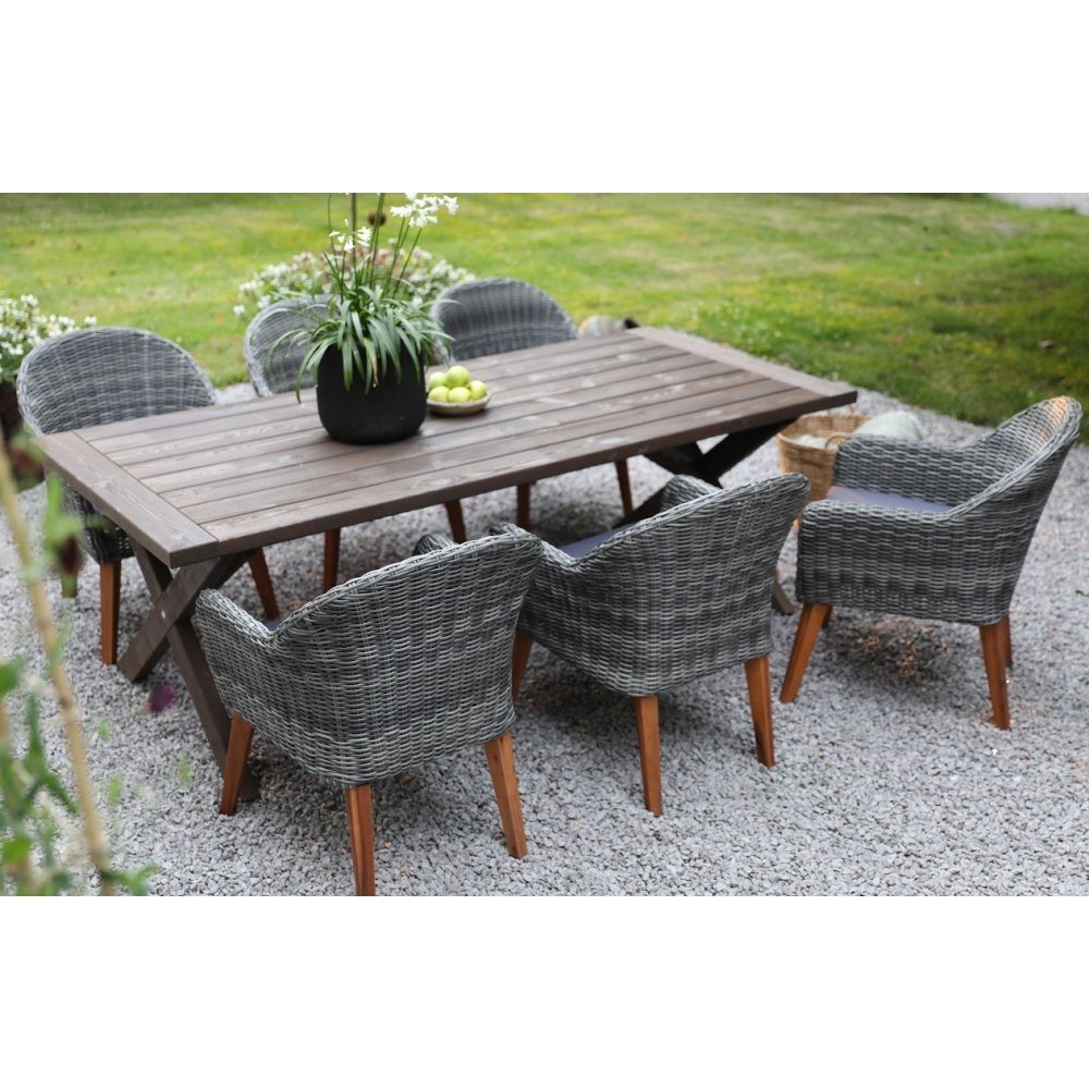 Die in dieser Outdoor-Möbelgruppe enthaltenen Gartenstühle sind Valetta und haben ein erdgraues Kunstrattan mit braunen Beinen und einem dunkelgrauen Sitzkissen. Diese Gartenmöbelgruppe umfasst 6 Stühle.