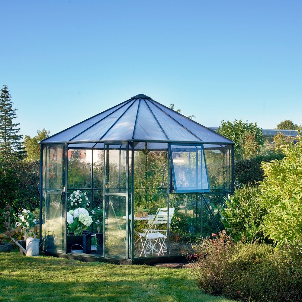 Atrium von Danish Halls ist ein schickes und elegantes sechseckiges Gewächshaus, das viel Platz sowohl für den Anbau als auch für gesellige Momente bietet. Es ist die perfekte Wahl für alle, die eine angenehme Umgebung für ihre Pflanzen schaffen und gleichzeitig einen Ort zum Entspannen haben möchten. Das Gewächshaus eignet sich sowohl als freistehender Außenbereich als auch als Kombination aus Anbau und Erholung.