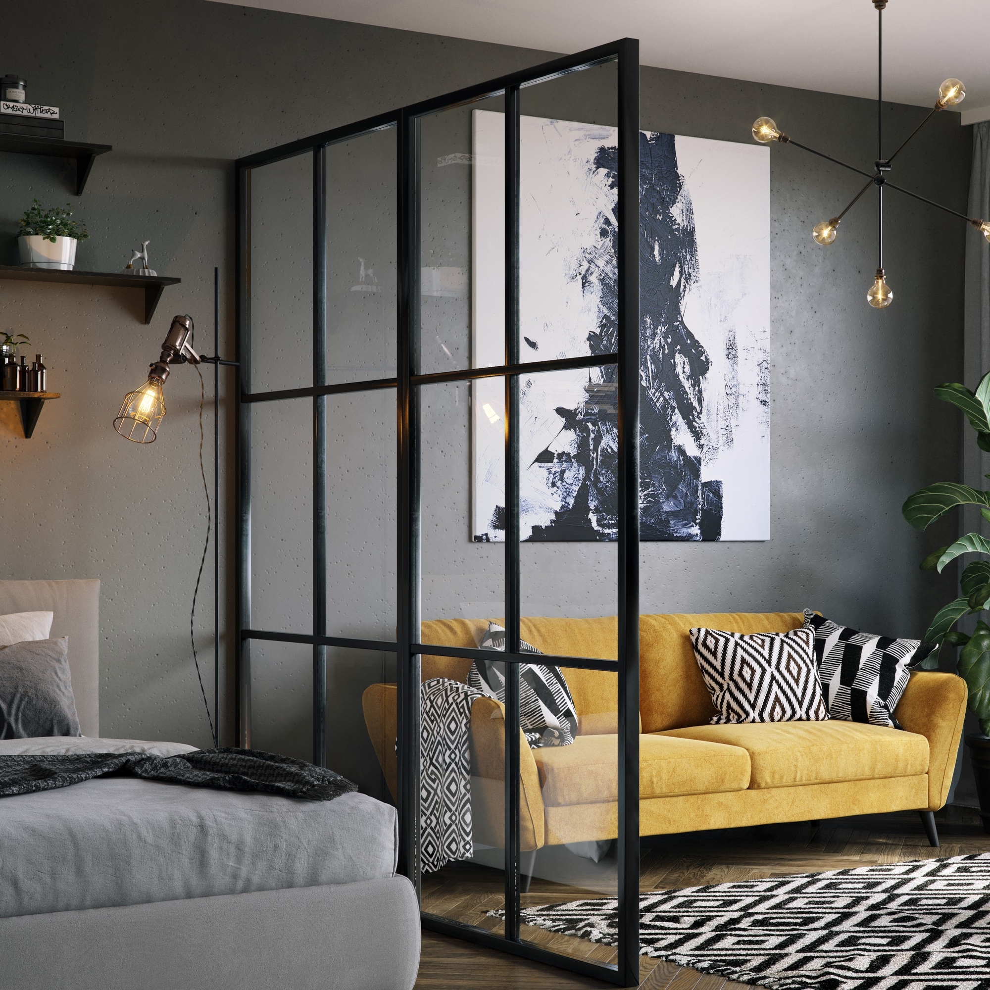 Es gibt oft unterschiedliche Bedürfnisse, um einen größeren Raum in kleinere zu unterteilen, und dann ist diese intelligente Lösung zur Hand. Eine stilvolle Glaswand, die das Licht durchlässt und optisch teilt, um Raum im Raum zu schaffen, in dem zum Beispiel ein Wohnzimmer auch ein Schlafzimmer wird.