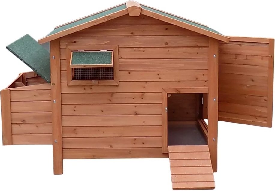 Für Hühner und Kaninchen geeignetes Haus aus Tannenholz mit schützendem Dach aus Schindeln.