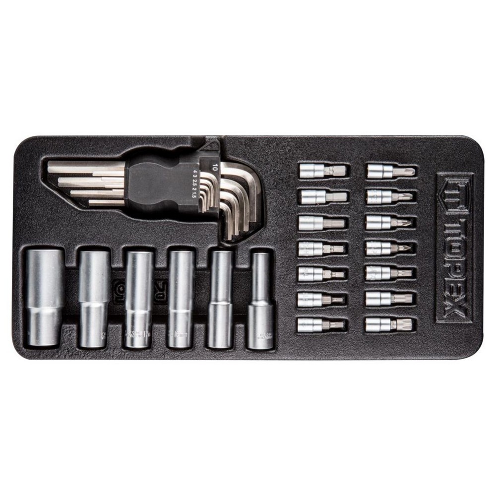 29-teiliger Steckschlüsselsatz, ein vielseitiger Satz für mechanische Aufgaben, mit Sechskantschlüsseln, Bits und Stecknüssen. Das Zubehör ist in einem Kunststoffhalter sortiert.