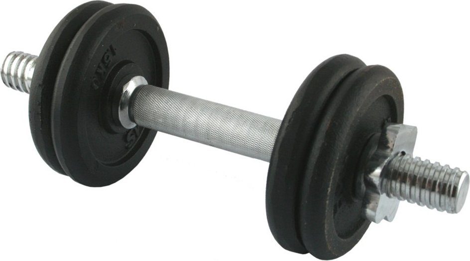 Eine einfache klassische Hantel mit gerändeltem Griff. Das Set beinhaltet eine vernickelte Stange und mehrere schwarze Eisengewichte.