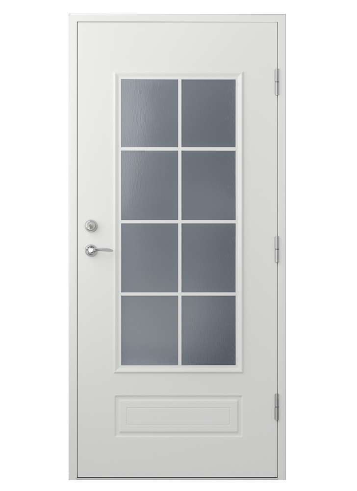 Vorteilhafterweise können Sie zwischen mehreren verschiedenen Glasarten wählen, je nachdem, ob Sie Privatsphäre wünschen oder nicht. Außerdem können Sie zwischen zwei verschiedenen Varianten der Größe des Fensters in der Tür wählen, siehe Optionsmenü. Wenn Sie sich für G12 entscheiden, hat die Tür ein Glasmaß von 12 dm und wenn Sie sich für G13 entscheiden, ist das Fenster noch größer, 13 dm.