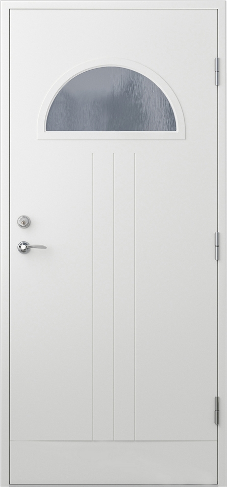 Haustür Carina mit Glas (ohne Lamellen) hat ein charmantes Halbmondfenster, das Ihnen angenehmes Licht in Ihren Eingang bringt. Die Tür ist mit Rillenfräslinien und Leisten verziert, die das Fenster umrahmen. Hier können Sie wählen, ob Sie Sichtschutz mit Cotswold-Glas oder Milchglas wünschen. Wenn Sie lieber sehen können, wer kommt, gibt es die Option Klarglas oder Sie können ein Sichtschutzglas mit einem Guckloch kombinieren. Diese schöne Tür passt gut zu den Klassikern, wie der traditionellen oder modernen Architektur.