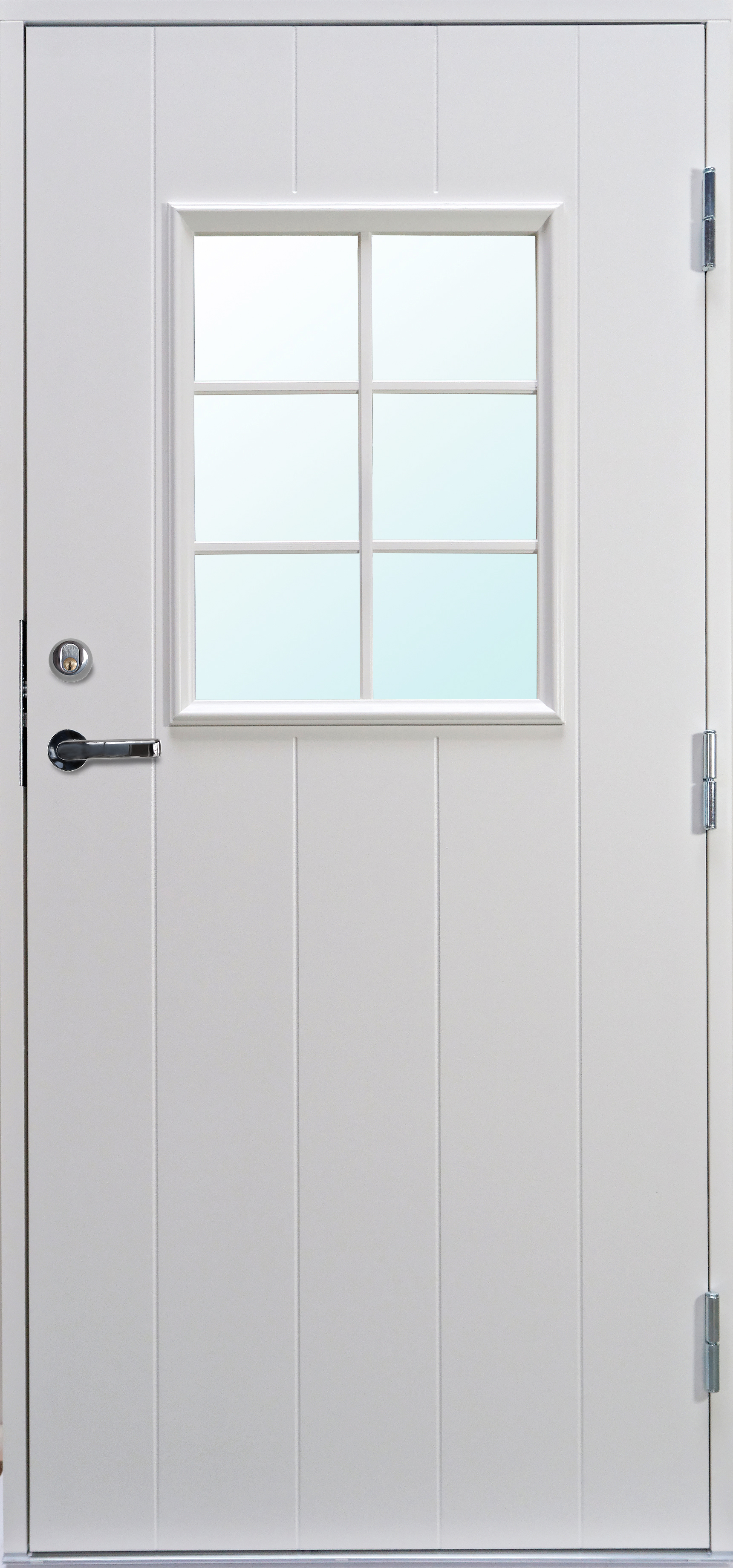 Die Haustür Christina hat ein klassisches schwedisches Design mit einem rechteckigen Fenster und schönen Lamellen, denen entlang der Tür gefräste Rillenstreifen folgen. Diese Tür passt perfekt zur traditionellen oder klassischen Architektur.