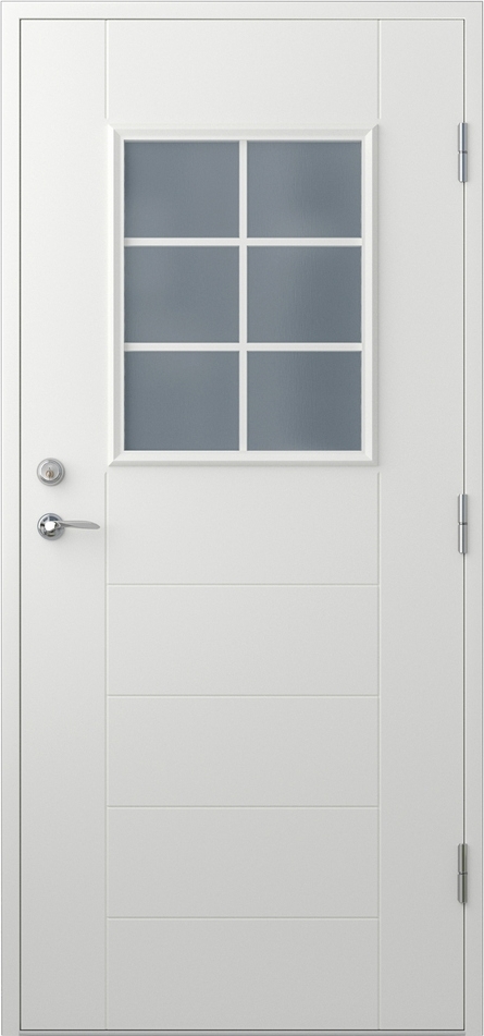 Das Fenster in der Tür ist eine gut isolierte 2-Glas-Kassette mit 4 mm Glas, 16 mm Argonfüllung und 4 mm Glas.