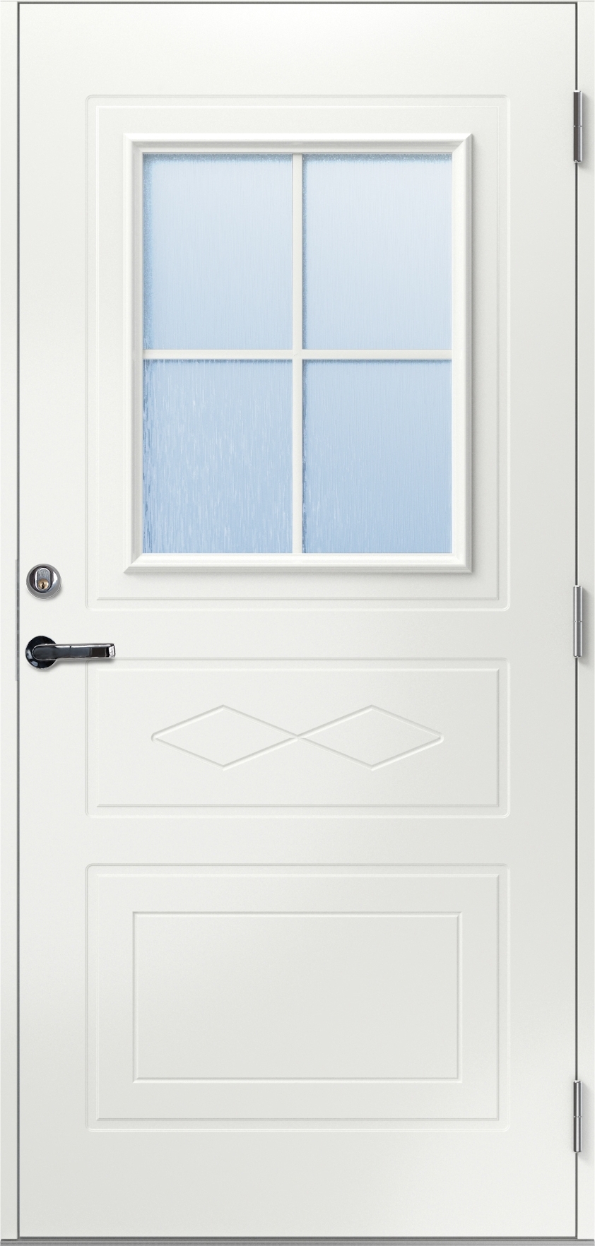 Die Tür hat einen Rahmen aus doppelt verleimtem Rahmenholz in Kiefer. Damit der Rahmen so stark wie möglich ist und nicht zusammenbricht, werden schmalere Kiefernstücke zusammengeleimt. Der Rahmen hat eine moderne Wärmedämmung im Inneren des Rahmens aus 50 mm Schaumkunststoff (EPS 200). Ein 0,4 mm starkes Aluminiumblech bedeckt sowohl die Innen- als auch die Außenseite für maximale Stabilität und Dichtigkeit. Auf diesem Aluminiumblech hat die Tür eine speziell entwickelte HDF-Platte , die wasserdicht und an unser Klima angepasst ist. Die Türschwelle ist geölt und aus der harten Holzart Eiche gefertigt, die sowohl attraktiv ist als auch viel rauer Behandlung standhält. Zusätzlich ist die Schwelle mit einem außenliegenden Aluminiumstreifen zum Schutz vor Feuchtigkeit ausgestattet. Der Türrahmen ist im Lieferumfang enthalten und aus Kiefernholz, das in der gleichen Farbe wie das Türblatt erhältlich ist.