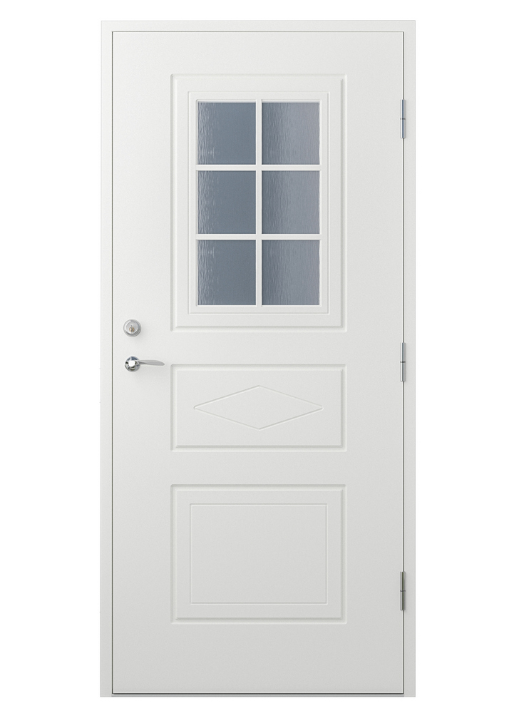 Haustür Lillian mit Glas, mit ihrem klassischen schwedischen Aussehen, hat einen schönen Lichteinfall durch das rechteckige Fenster. Sowohl das Licht als auch der Charakter der Tür tragen zu einer angenehmen und einladenden Umgebung im Eingangsbereich bei. Die Tür ist gut dekoriert mit gerillten Spiegeln und Linien, die das Fenster einrahmen, was gut in die traditionelle oder klassische Umgebung passt. Die Lamellen sind feststehend und das Glas ist in optionalen Designs erhältlich.