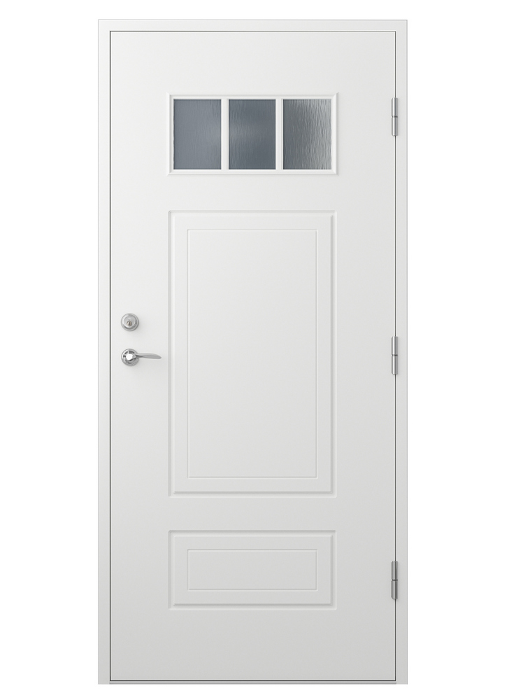 Haustür Louise mit Glas hat ein klassisches Rillenfräsmuster in Form eines größeren und eines kleineren Spiegels mit Doppelstreifen. Darüber befindet sich ein schmales rechteckiges Fenster mit Dekoration aus einfachen Lamellen, das Tageslicht in die Halle lässt. Die Tür hat eine schlichte Formensprache, die sich überall einfügt, sowohl in das traditionelle als auch in das moderne Haus.