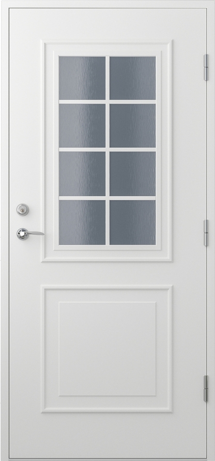Das Fenster in der Tür ist eine gut isolierte 2-Glas-Kassette mit 4 mm Glas, 16 mm Argonfüllung zwischen den Scheiben.