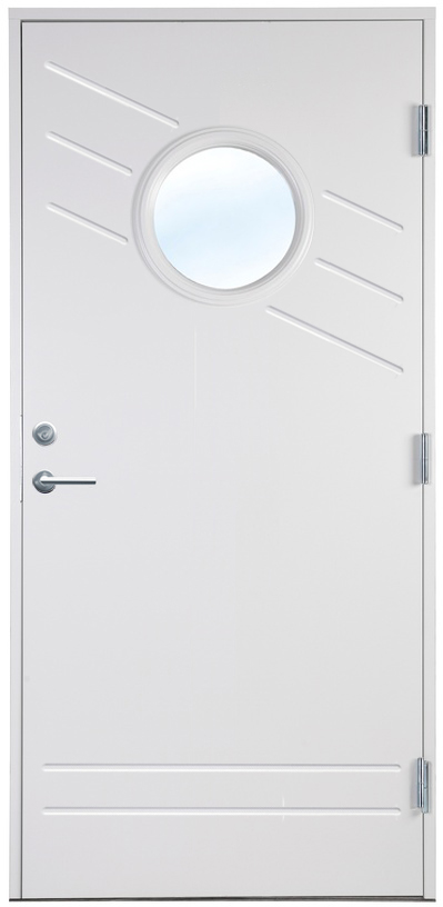 Die Haustür Simrishamn mit Glas hat ein einfaches, verspieltes Design mit schönen runden Fenstern, die von drei gerillten Linien durchzogen sind. Die untere Kante der Tür hat auch zwei dekorative Linien, die mehr Charakter verleihen. Die Verspieltheit der Tür kann durch eine schöne Farbe verstärkt werden, die der modernen Architektur einen zusätzlichen Hingucker verleiht (siehe Beispielbild 2).