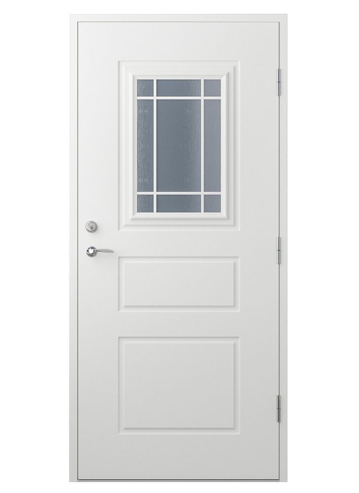 Die Tür hat einen Rahmen aus doppelt verleimtem Rahmenholz in Kiefer. Damit der Rahmen so stark wie möglich ist und nicht zusammenbricht, werden schmalere Kiefernstücke zusammengeleimt. Der Rahmen hat eine moderne Wärmedämmung im Inneren des Rahmens aus 50 mm Schaumkunststoff (EPS 200). Ein 0,5 mm starkes Aluminiumblech bedeckt sowohl die Innen- als auch die Außenseite für maximale Stabilität und Dichtigkeit. Auf diesem Aluminiumblech befindet sich auf der Tür eine speziell entwickelte HDF-Platte, die wasserdicht und an unser Klima angepasst ist. Die Türschwelle ist geölt und aus der harten Holzart Eiche gefertigt, die sowohl attraktiv ist als auch viel rauer Behandlung standhält. Zusätzlich ist die Schwelle mit einem außenliegenden Aluminiumstreifen zum Schutz vor Feuchtigkeit ausgestattet. Der Türrahmen ist im Lieferumfang enthalten und aus Kiefernholz, das in der gleichen Farbe wie das Türblatt erhältlich ist.