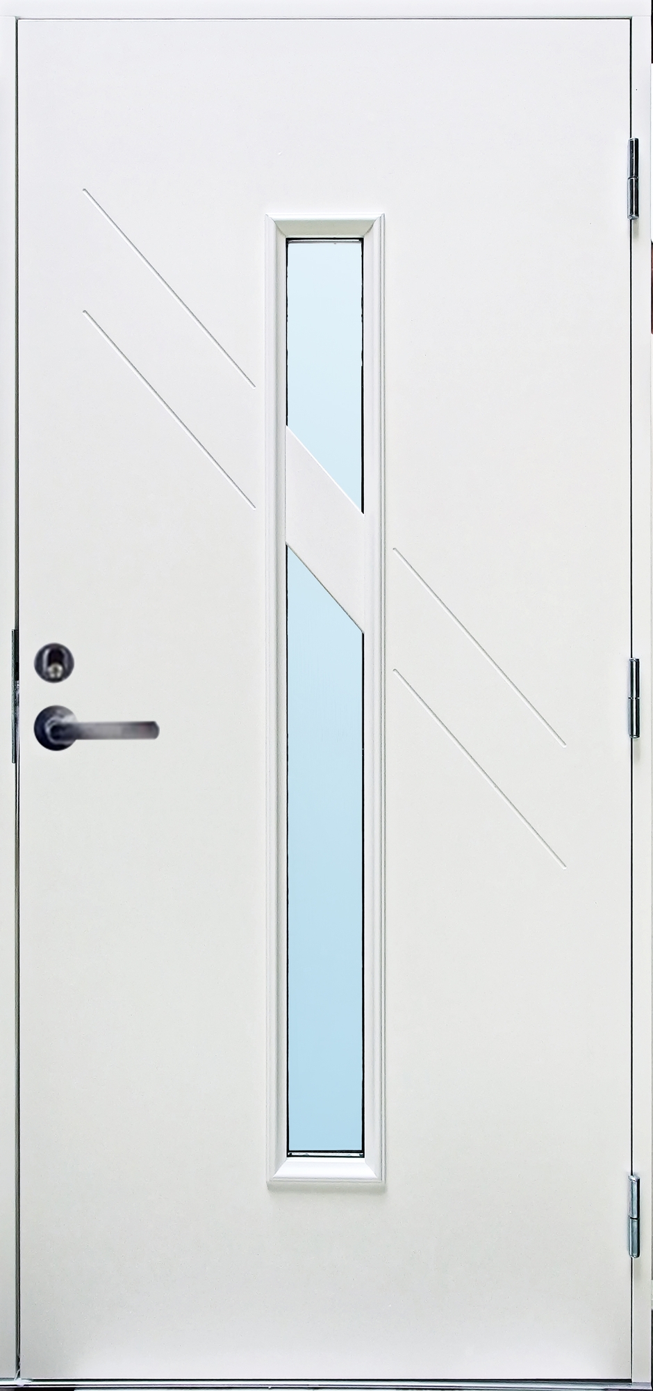 Die Haustür Stenhamra hat eine schräge Linie, die über die längliche schmale Fensterscheibe geht und sich in einem Rillenmuster über der Tür fortsetzt. Das macht das Design der Tür spannend und besonders. Diese andere Tür hat einen schönen Lichteinfall, der zur angenehmen Umgebung der Halle beiträgt. Mit ihrer innovativen Formensprache fügt sich die Tür galant in die moderne Villa ein.