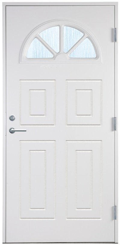 Die Außentür Vadstena mit Glas hat ein schönes Halbmondfenster mit Lamellen, das in verschiedenen Glasausführungen erhältlich ist und unabhängig von Ihrer Glaswahl zu einem schönen Lichteinfall in Ihre Halle beiträgt. Das Rillenfräsmuster formt vier Spiegel in zwei Größen als edle Dekoration mit dreidimensionaler Haptik. Die Tür passt gut zum Landhaus wie der traditionellen oder der klassischen Architektur.