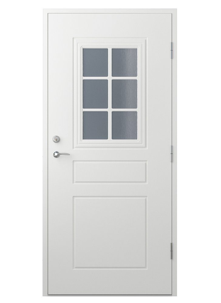 Die Haustür Warsawa hat ein klassisches schwedisches Design, das wir gut wiedererkennen. Das rechteckige Fenster lässt viel Licht herein und wird zusammen mit den Lamellen zu einer schönen Dekoration. Sein rillengefrästes Muster bildet darunter einfache Spiegel, die das Fenster gut ausbalancieren. Diese Tür passt perfekt zur traditionellen oder klassischen Architektur.