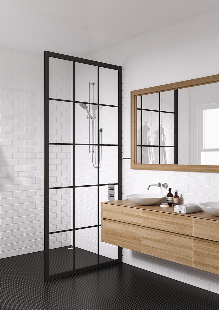Die Duschwand lässt sich vorteilhaft in einem individuell gestalteten Bad einsetzen, da sie komplett schwellenlos ist und Sie nichts übersteigen müssen.