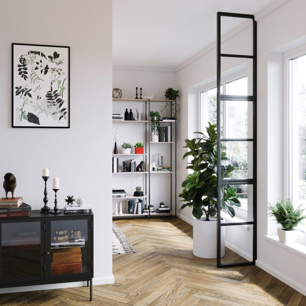 Wenn Sie Ihrem Wohnambiente mehr Flair und Charakter verleihen möchten, ist dieser stilvolle Raumteiler im Industriedesign eine hervorragende Wahl. Die Wand ist sowohl stilvoll als auch praktisch, da sie Licht durchlässt und ein Gefühl von Raum vermittelt, während sie gleichzeitig optisch abschirmt und Geräusche reduziert.