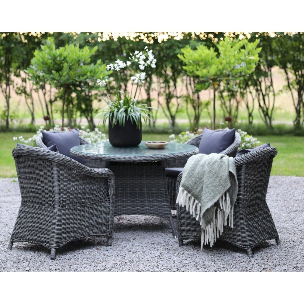 Essgruppe mit 1 runden Esstisch aus grauem Kunstrattan mit gehärtetem Glas als Platte, einschließlich 4 Mercury-Sesseln aus passendem grauem Kunstrattan mit Sitzkissen und Rückenkissen für besten Komfort. Die Essgruppe passt perfekt auf Balkon, Terrasse und in den Wintergarten.