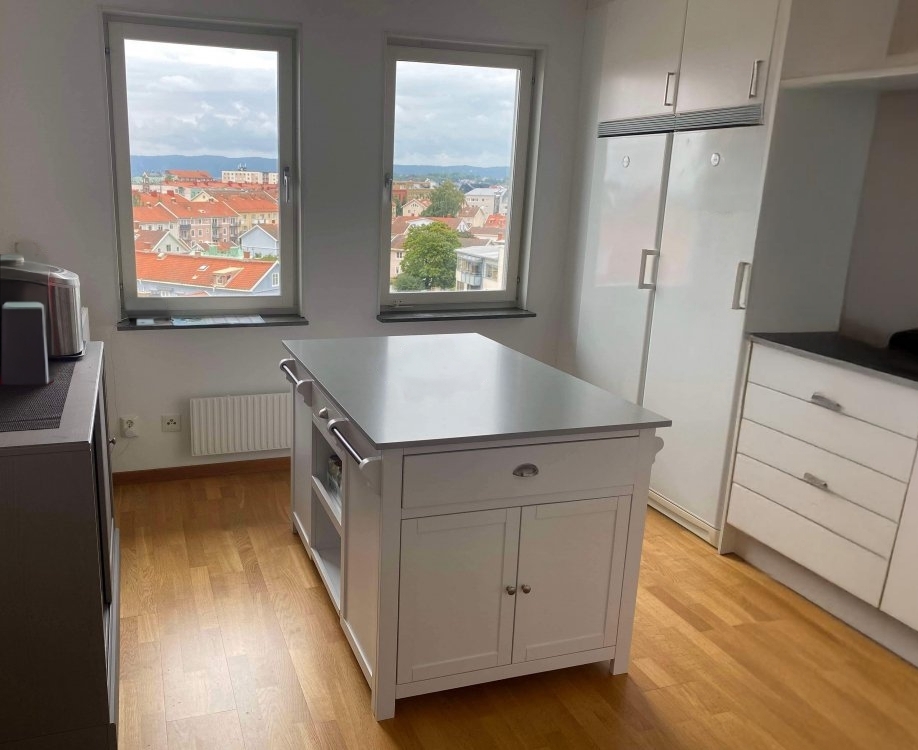 Die Kücheninsel verfügt über ein Regal in der Mitte zur offenen Aufbewahrung und zwei geräumige Schränke ohne Regale an den Seiten. Die perfekte Aufbewahrung für größere Küchenutensilien. Schwarze Metallbeschläge und Handtuchhalter bilden einen schönen Kontrast zur weiß lackierten Oberfläche.