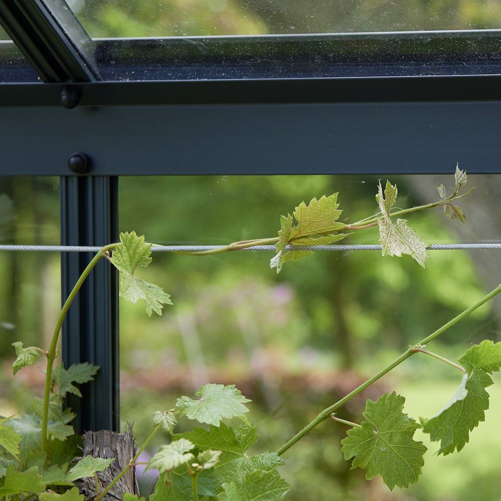 Dieses Drahtset ist für die Montage im Profilsystem des Gewächshauses vorgesehen und bietet eine flexible und stabile Lösung zum Aufhängen verschiedener Zubehörteile oder Pflanzen, die zusätzliche Unterstützung benötigen.