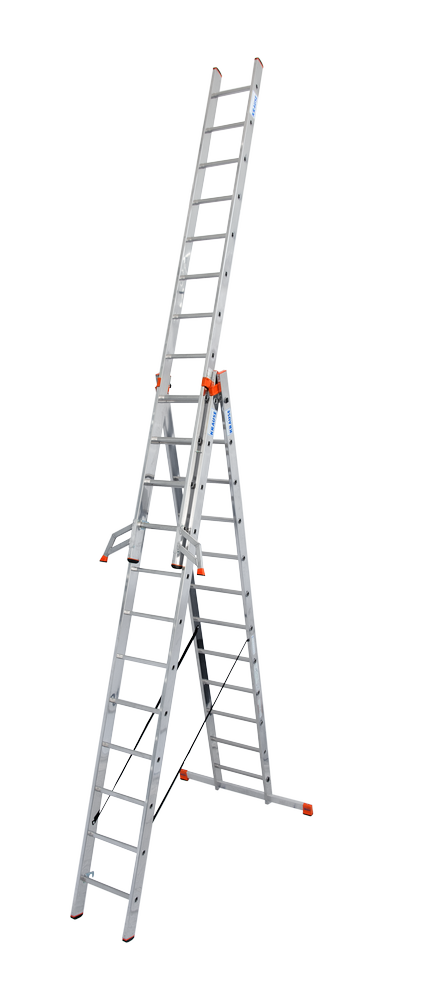 Diese multifunktionale Alu-Leiter können Sie vielseitig einsetzen und mit der praktischen Treppenfunktion auch auf Treppen und anderen unebenen Flächen einsetzen. Sie können die Leiter als Schiebeleiter, Anlegeleiter oder Trittleiter verwenden. Die Leiter ist in 3 Teile geteilt, jedes der Teile hat 12 Stufen und eine Länge von 3,40 Meter, was Ihnen eine Arbeitshöhe von bis zu ca. 9,30 Meter ermöglicht und die Leiter hat eine Tragfähigkeit von 150 kg. Die Leiter hat einen starken Anti-Rutsch-Schutz, der sie stabil und sicher macht.