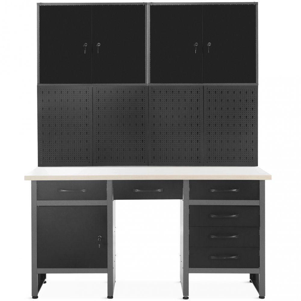 Haben Sie Probleme, Ordnung in Ihrem Hobbyraum, Ihrer Garage oder Werkstatt zu halten? Dann ist dieses Werkstattsystem genau das Richtige für Sie! Mit insgesamt 9 verschiedenen Ablagefächern organisieren Sie alles in Ihrer Garage oder Werkstatt ganz einfach. Zwei stabile Oberschränke, ein niedriger Vorratsschrank und sechs Schubladen bieten Ihnen Platz für alles, was Sie brauchen. Zu diesem System gehört auch eine stabile Werkbank mit einer Stärke von 32 mm, die Ihnen freies Arbeiten mit allen Werkzeugen und Utensilien in Griffweite ermöglicht. Als ob das nicht genug wäre, ist eine perforierte Werkzeugtafel im Lieferumfang enthalten, die mit mehreren verschiedenen Arten von Aufhängern und Haken ausgestattet ist. Nutzen Sie dieses Werkstattsystem und bringen Sie ein für alle Mal Ordnung in Ihre Garage!